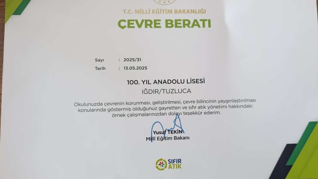 Öğretmen ve Öğrencileri tarafından yürütülen SIFIR ATIK yarışmasında il birinciliği elde eden okuluumuza Milli Eğitim Bakanı Yusuf TEKİN tarafından ÇEVRE BERATI verilşmiştir. Emeği geçen tüm personelimize teşekkür ederiz.